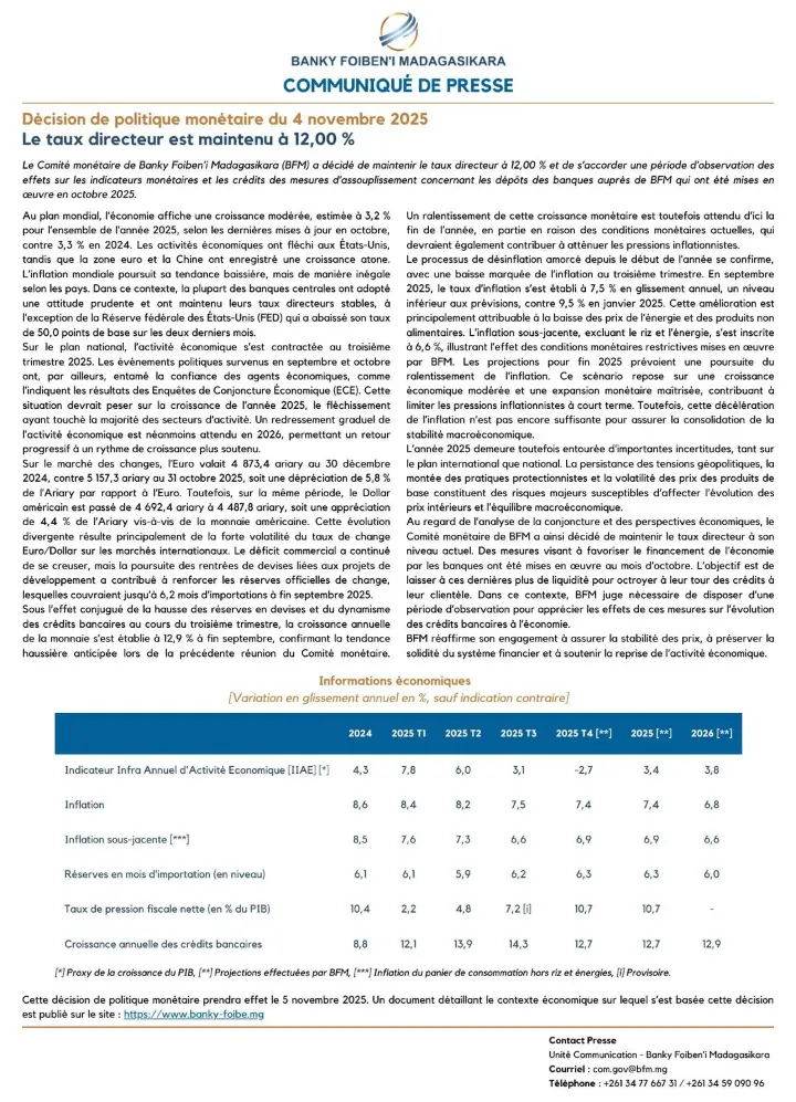 Le 4 novembre 2025, la Banque Centrale de Madagascar (BFM) a annoncé le maintien du taux directeur à 12%.